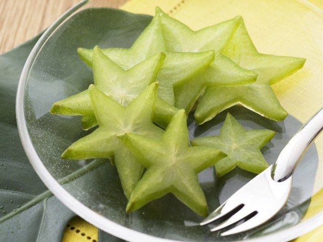 Star Fruit AKA Carambola Wallpaper shows a juicy, crunchy fruit that can be eaten skin, seeds and all. Star fruit tastes like a combination of pineapple and lemon. The flavor may be tart or sweet. You can eat all the star fruit you want if you have no kidney problems. But if your kidneys are impaired eating star fruit can be dangerous. This fruit is gaining in popularity in the U.S. It derives its name from the fact that when sliced it has the shape of a star.