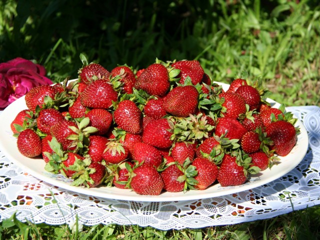 Strawberries Inside Out Wallpaper pictures a plate of red berries. Strawberries are unique. Their seeds are outside not inside like other fruit. The strawberry is a member of the rose family. It is the first fruit that ripens in the spring. Years ago, the American colonists crushed the berries and mixed them with cornmeal. Then they were baked into bread. This was the first recipe for Strawberry Shortcake!